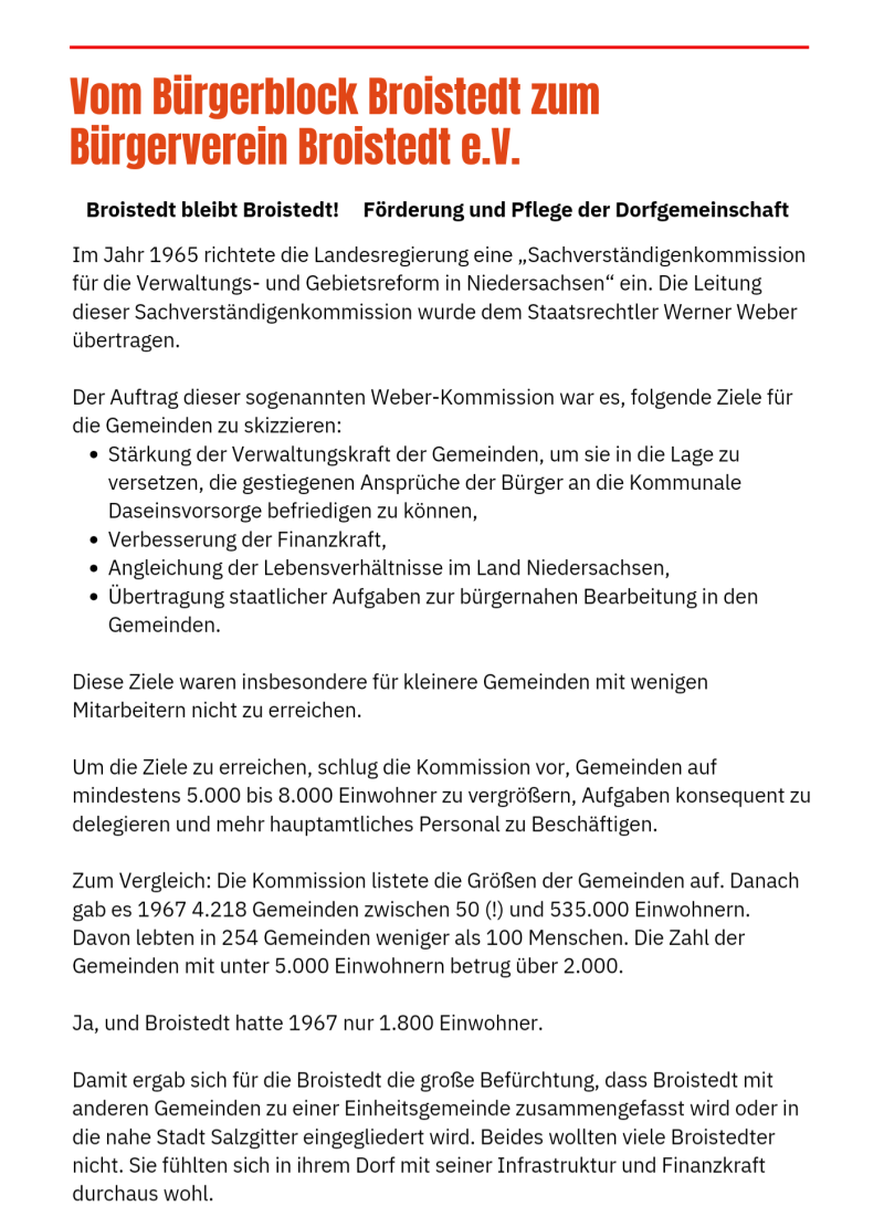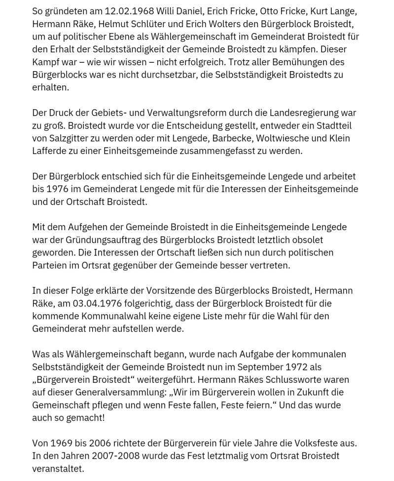 Der Vorsitzende Manfred Leßmann berichtete über die vielen Aktivitäten, welche der Bürgerverein für die Broistedter und Lengeder Bevölkerung im vergangenen Jahr angeboten hat und auch in Zukunft anbietet. Neben einer Besichtigung des Schacht Konrad, Vorträgen zu verschiedenen Themen, Weinfest, Radtouren, Spielenachmittagen und verschiedenen Busreisen bietet der Bürgerverein weitere Aktivitäten in und um Broistedt an und lädt zum Mitmachen ein. Nicht zuletzt sei natürlich das Volksfest erwähnt, welches auch dieses Jahr wieder stattfinden wird (29. bis 31. August). Am Schluss des Berichts des Vorsitzenden gab Manfred Leßmann bekannt, dass dieser sich aus dem Vorstand zurückziehen möchte, aber dem Verein treu bleibe. Ihm sei die Entscheidung nicht leichtgefallen, aber sei eine dem Alter gerechte Entscheidung.